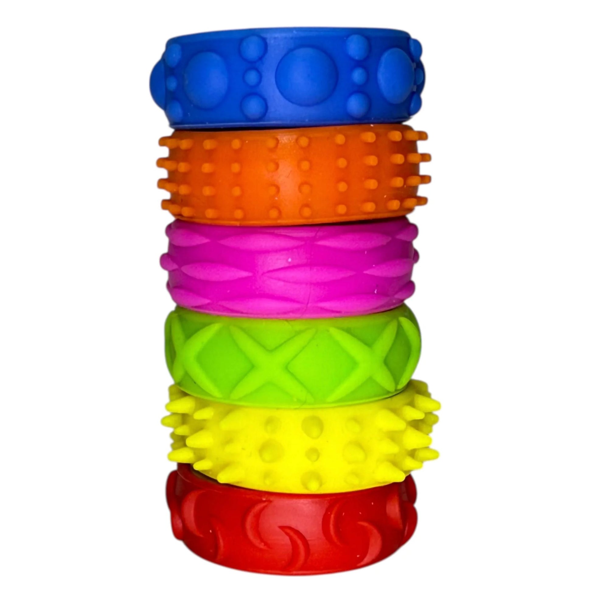 The pack includes six bright, colourful bands, each with a unique texture: soft flexible spikes, fine bristle-like bumps, dots, crosses. The removable outer silicone ring makes it easy to clean or mix and match colours.