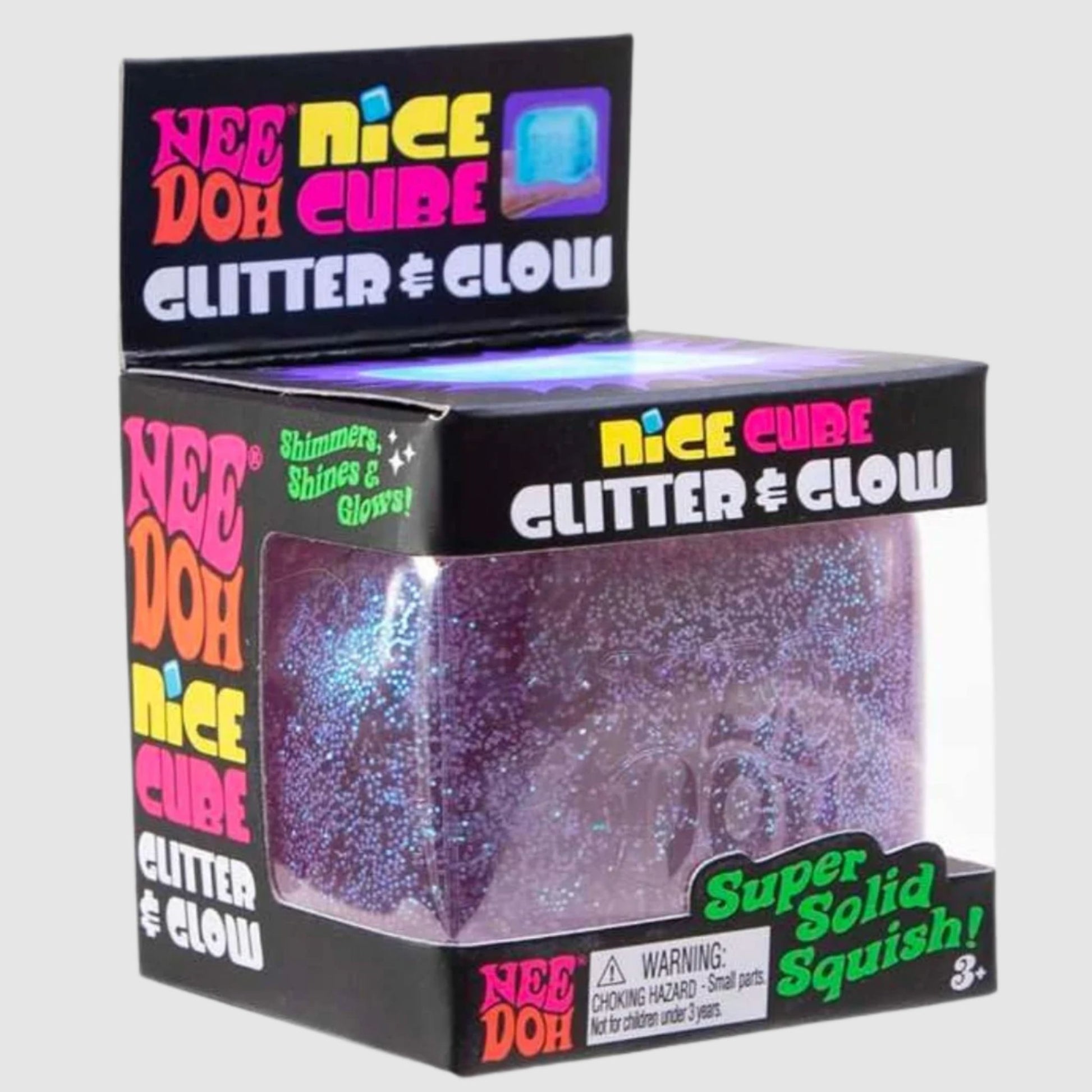 Discover sensory satisfaction with the NeeDoh Nice Cube Glitter & Glow! True to its name, each cube features a shimmering glitter core that glows in the dark for an eye-catching visual treat. The unique squish experience feels soft and yielding when pressed slowly, yet firm and responsive when squeezed quickly, creating a dynamic tactile sensation.